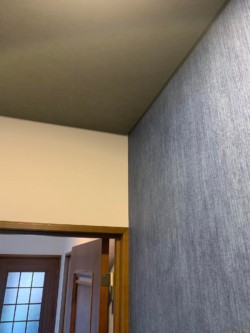→クロス 天井を、黒、壁をアクセントにデニム柄 メインを、ホワイトのテラコッタ風 床を木目で仕上げまして